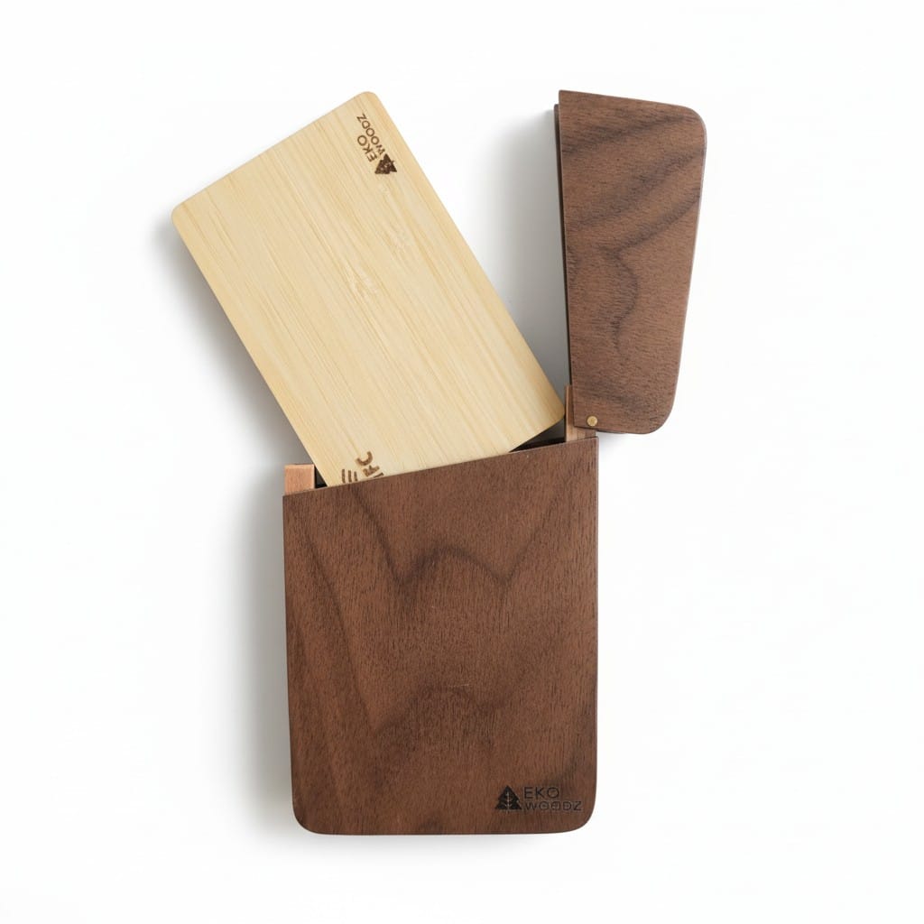 O Porta‑Cartões de Visita em Madeira de Nogueira Premium é produzido em nogueira maciça selecionada, preservando o grão natural e a tonalidade marrom escura característica dessa madeira nobre. Cada peça é única, com textura e nuances próprias, trazendo sofisticação imediata para sua mesa ou rotina de trabalho.